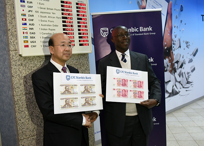 中国驻肯尼亚大使刘显法在标准银行肯尼亚分行总部用1000元人民币兑换了当地货币肯尼亚先令,标准银行肯尼亚分行行长菲利普·奥德拉也用肯先令兑换了人民币,成为首批体验人民币现钞自由兑换业务的客户。