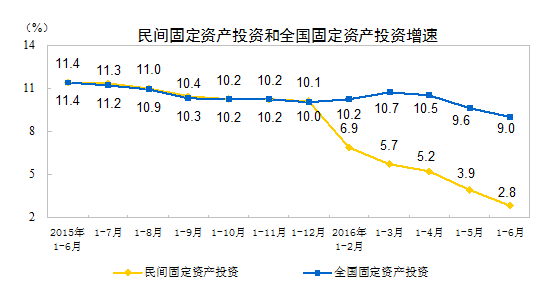 庖丁解牛来看具体运行数据,中国经济下行压力仍然很大。对经济景气度非常灵敏的指标民间固定资产投资,1-6月份投资总额15.8797万亿元,增速回落至2.8%,快逼近零增长。