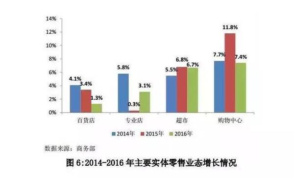 据商务部重点流通企业监测数据,2016年便利店、购物中心、超市销售额增长较快,增速分别为7.7%、7.4%和6.7%;专业店、百货店销售额增长较慢,增速分别为3.1%和1.3%,百货店增速较上年下降2.1个百分点,专业店增速比上年提高2.8个百分点。