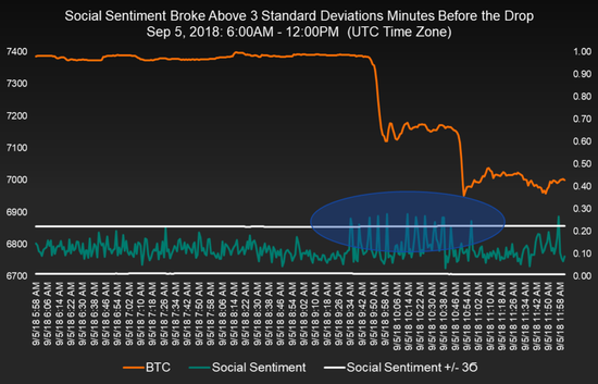 该图表并不表示看涨或看跌,而是对“不真实的”活动的即时反应。历史数据表明,社交情绪多于平均值3个标准差以上的情况,被认为是“不真实的”。今日早间,在加密市场下挫10到15分钟前,社交情绪超出3个标准差的情况出现了,这足以让人相信存在市场操纵或内幕交易的问题。
