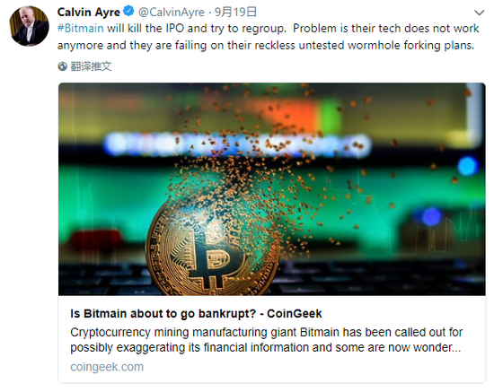 新浪科技讯 9月21日上午消息,关于早间Coingeek创始人Calvin Ayre在上发文表示,比特大陆将终止IPO并尝试重组消息,比特大陆官方对新浪科技表示,不予置评。