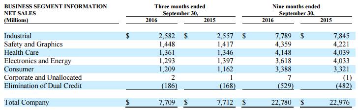 而3M公司去年第三季度除了安全防护业务板块销售增加2%外,保健和消费品业务分别增加1.5%和2.9%,而电力能源业务则大幅下降8.1%,同时工业制造业务下降1.1%。