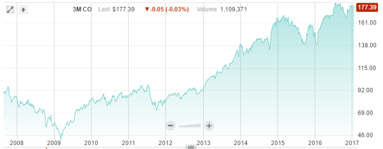 而从股价上看,自2009年触底反弹之后,3M公司股价从不到46美元升至如今的177美元(2011年年中有一次大跌)。但从2015年起,其股价涨势已不再那么稳定。