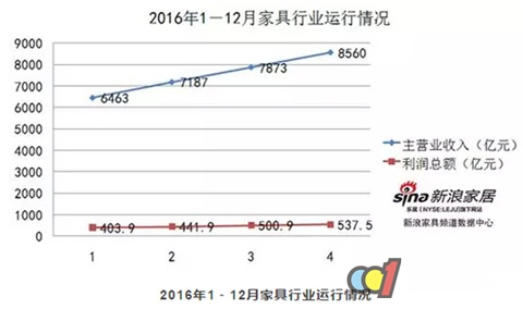 2016年,家具行业是全国消费品领域里增长比较快的行业。不足行业10%的微小企业完成工业总产值同期增长8.57%,累计完成利润537.48亿的成绩。而家具的产量一年也实现了7亿946万件的产出,同比增长1.27%。虽然只是微小企业的数据,但也可以估测家具行业在2016年总体是增长的。而仅仅8.57%的增长,也使2016年成为继2013年14.3%,2014年10.9%,2015年9.3%的增长后第三年增速放缓。数据的对比凸显了家具行业面临的巨大挑战。