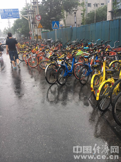 陶然亭地铁站附近的道路上,共享单车大方的停在非机动车道上,为雨后的北京平添几分不便。