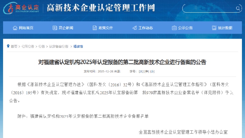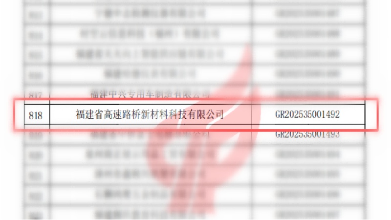 中经联播讯(庄秋风 马海彤 通讯员 李源 戴韵璇)近日,全国高新技术企业认定管理工作领导小组办公室发布2025年第二批高新技术企业公示名单,福建高速路桥新材料公司成功入选,获评“国家高新技术企业”。