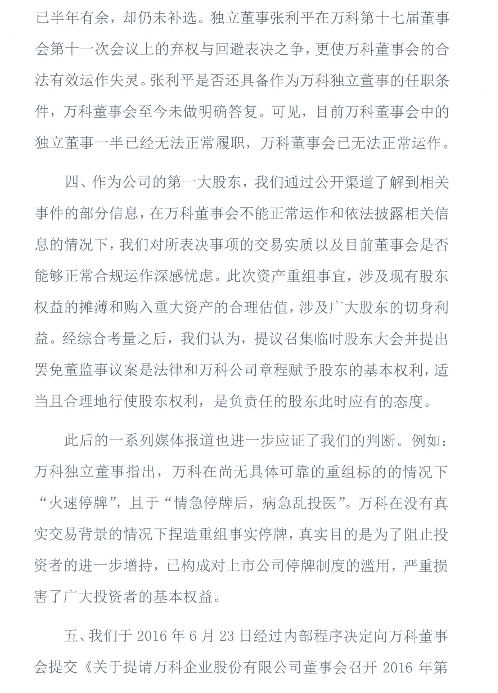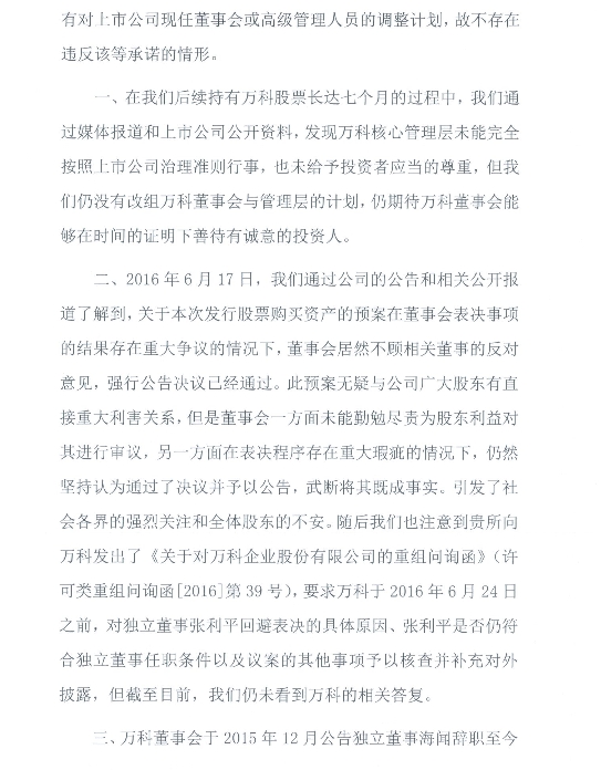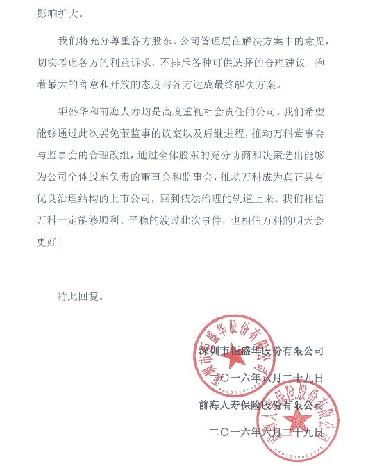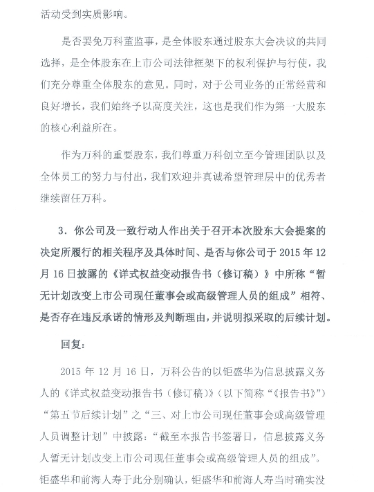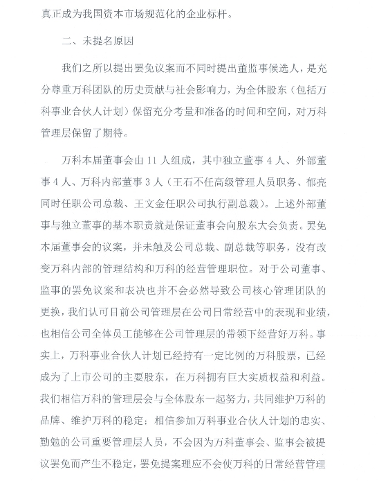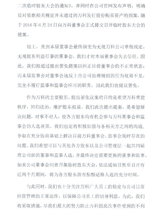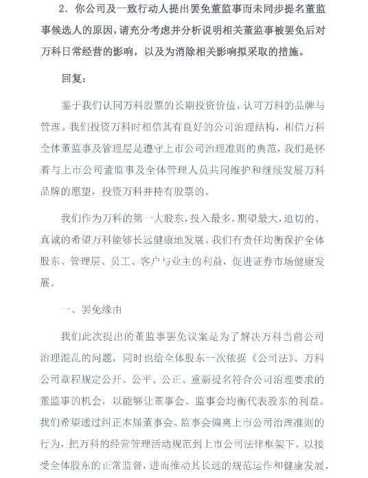 同时,问及罢免董监事对万科日常经营的影响,宝能回答作为万科第一大股东,真诚希望万科能够长远健康发展,罢免是为了解决万科当前的治理 混乱的问题,而不同时提出董监事候选人,是为全体股东(包括万科事业合伙人)保留充分考量和准备的时间和空间,对万科管理层保留了 期待。同时表示,仍然期待万科董事会能够善待有诚意的投资人。
