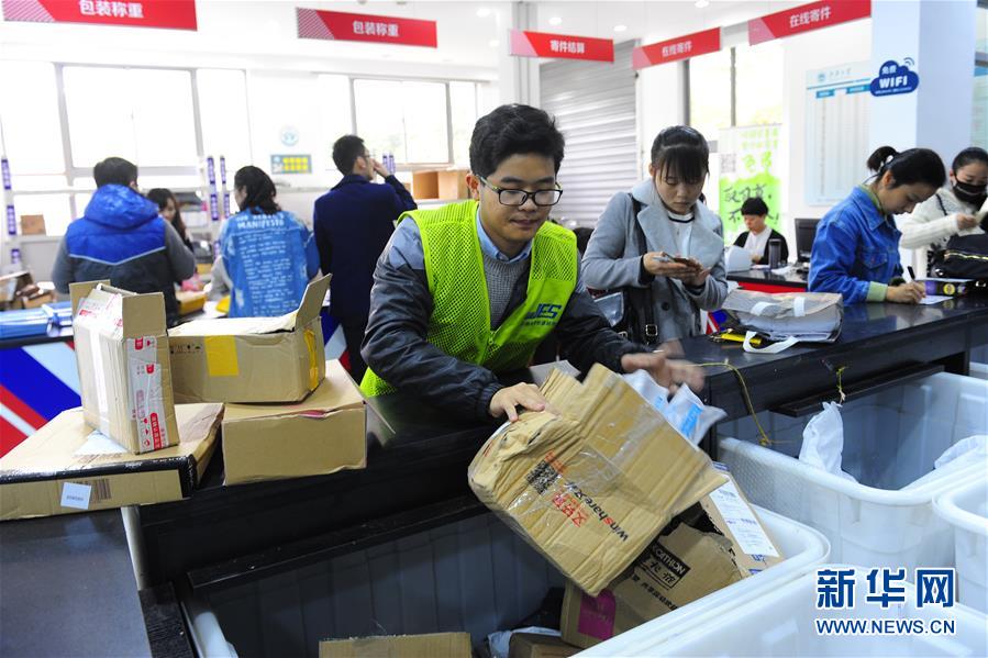 11月16日,在江苏无锡的江南大学快递超市,一名快递收发人员挑选可以再次利用的纸箱。