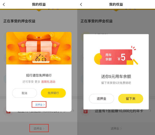 笔者实际操作退押金流程发现,退款前的“挽留”提醒多达7次,有“招行邀您免押骑行”、软广提醒、优惠吸引、“送你5元用车余额”等,且“退押金”字样字号小、颜色浅,稍不留意就会掉入陷阱。