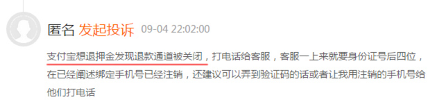 此外,有用户反映ofo小黄车支付宝退款通道被关闭。
