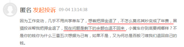 对投诉案例进行纵向分析可见,用户对ofo小黄车的投诉主要集中在退押金和余额上,梳理有以下三种情况: