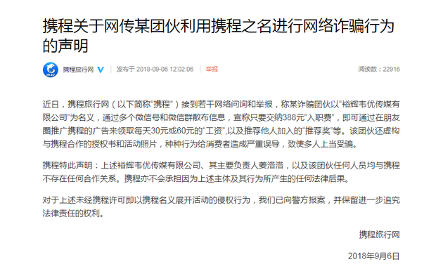 携程在微博中表示,携程接到若干网络问询和举报,称某诈骗团伙以“裕辉韦优传媒有限公司”为名义,通过多个微信号和微信群散布信息,宣称只要交纳388元“入职费”,即可通过在朋友圈推广携程的广告来领取每天30元或60元的“工资”,以及推荐他人加入的“推荐奖”等。