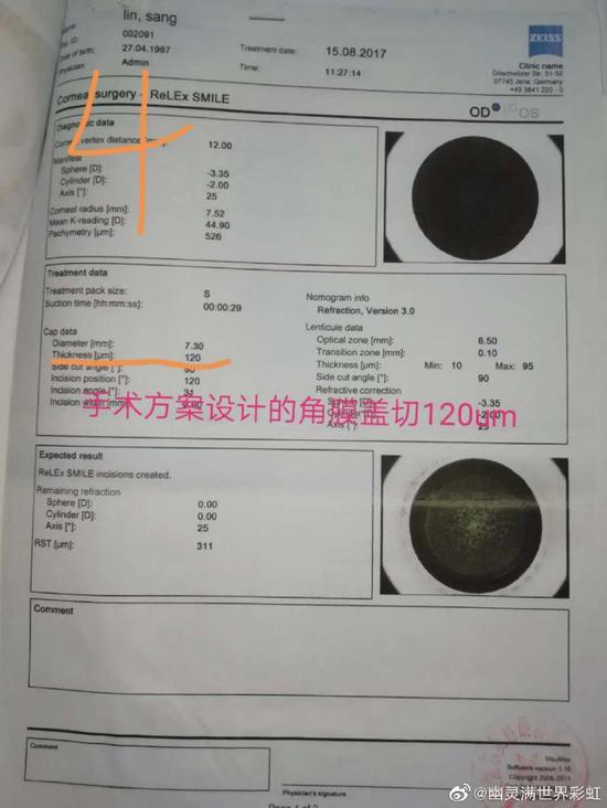但是,术前主刀医生彭院长并没有按照要求对手术方案以及手术后遗症、禁忌症等进行对话沟通。该名员工术后第一天视力就0.25,经过这三年多的治疗观察现在双眼裸眼视力0.05,矫正视力0.2,视力持续下降,反复干眼,畏光,暗视力差,严重炫光(彩虹圈加星爆),炫光引起头疼,重影,飞文症,眼睛疼,眼痒,异物感,视疲劳,聚焦困难,视觉质量差,视觉迟钝,疑似圆锥角膜。