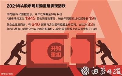 2021年A股市场并购重组表现活跃。《证券日报》记者据同花顺iFinD数据统计,按首次公告日并剔除交易失败案例来看,今年以来截至10月24日,A股市场共发生1945起公司并购事件,较去年同期的1640起增长19%。就企业性质而言,有640起参与方为国有控股上市公司,占比为33%。