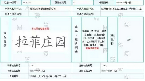 2005年,金色希望公司申请注册“拉菲庄园”商标,并于2007年被核准注册,核定使用在第33类葡萄酒、酒(饮料)、果酒(含酒精)、蒸馏酒精饮料等商品上。