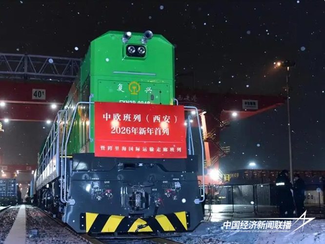 2026年元旦零点,两列班列在风雪中分别从古都西安的陆港与空港坚定启程:一列满载光伏组件的中欧班列驶向阿塞拜疆巴库,标志着跨里海国际运输走廊新一年的开篇;