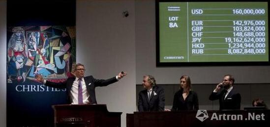 图为2015年5月11日,在佳士得“展望过去”专场拍卖行上,毕加索油画《阿尔及尔的女人》“O”版本,以近1.79亿美元价格打破世界纪录,成为全球最昂贵的艺术品