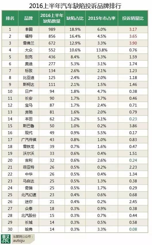 当然,福特也不是没有进步。用“缺陷占比”去除以“2015年市占率”,可获得“投诉销量比”,理论上正常值为1,越大说明投诉率越高。福特今年上半年的该参数为3.65,比起2015年下半年的4.35,还是要有所好转。