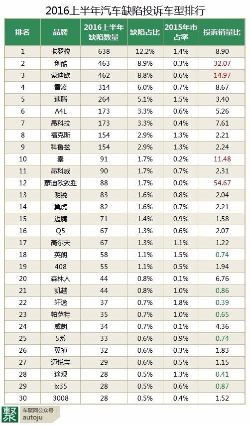 读者看到这里可能会说,为啥落下第2名不说?这张面孔在第一季度榜单上并未出现——雪佛兰创酷,但是上半年却以463例仅次于卡罗拉,轮胎问题占据441例。而在“投诉销量比”上,32%仅次于致胜。