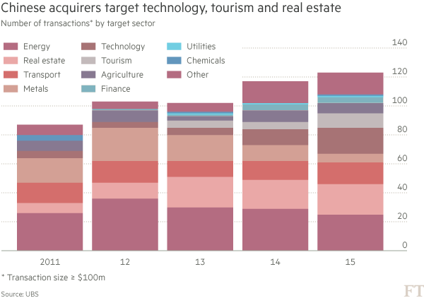 相反,自2012年以来,能源和金属等“旧经济”部门——跟中国正尝试摆脱的投资驱动的增长模式相关——的并购交易数量,不论是绝对值还是占比都大幅下降。