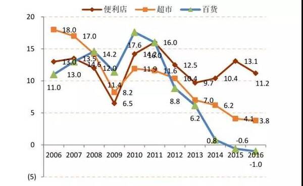 另一方面,根据数据显示,中国便利店销售额占实体零售额的比重2013年起加速上升,2016年便利店份额为0.65%。并且,便利店销售额增速从2010年起一直保持两位数,2011年起超越百货和超市增速;百货和超市销售额增速从2011年起快速下降,百货在2015、2016年增速为负。