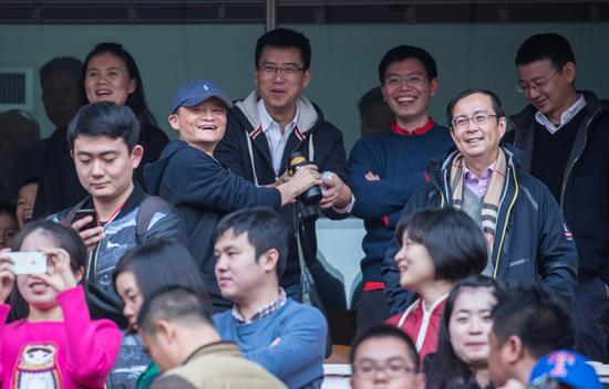 2015年2月14日,浙江杭州,马云携阿里巴巴高管张勇、彭蕾等现身黄龙体育中心,观看2015年中国足协超级杯赛。