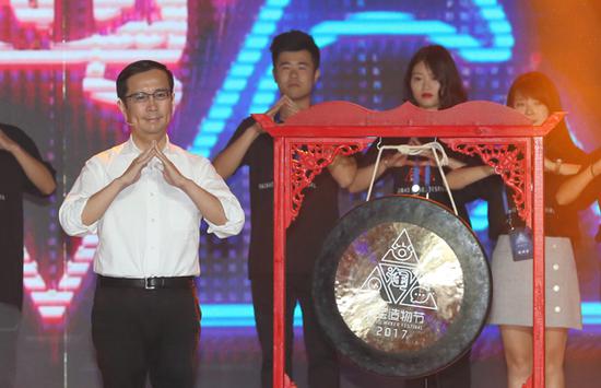 2017年7月8日,杭州国际博览中心,张勇敲锣宣布2017淘宝造物节开幕,并与造物者们一起做出造物节手势。