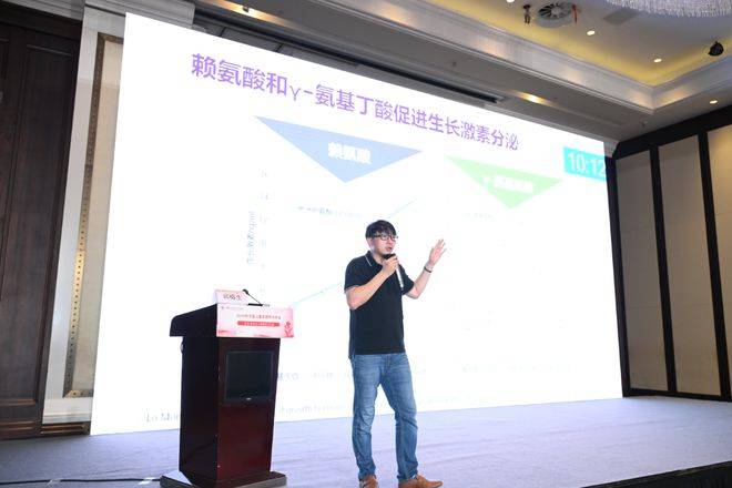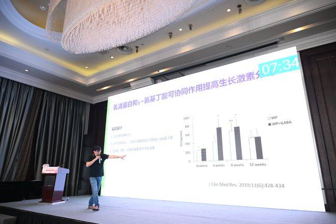 邱博士首先从生长调控的生长激素分泌下丘脑-垂体轴出发,阐释生长激素如何作为调节生长的主要激素,通过肝脏产生的生长因子IGF-1发挥效用,最终作用于骨骼生长板,从而促进人体生长。随后通过临床研究数据和科学理论,系统化论证赖氨酸、γ氨基丁酸、乳清蛋白可以激发”生长因子(生长激素)”,是中枢系统对生长的调控指挥官。一方面,赖氨酸补充能刺激生长激素分泌,另一方面作为“第一限制性氨基酸”,按照WHO的推荐在快速生长阶段,人体对赖氨酸的需要量是成年后的3倍。多个临床研究表明,补充赖氨酸3个月可比对照组多长0.65cm至3.1cm。γ氨基丁酸与乳清蛋白能够协同增效加强生长因子的产生,从而改善生长发育。临床研究表明,给儿童补充γ氨基丁酸能够使每年生长速率提高。