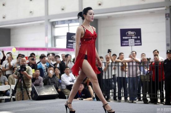 2016年6月3日,陕西西安,2016新丝路中国(西安)幸福之道国际论坛暨第七届中国西安生殖健康产业博览会在西安曲江会展中心开幕。美女模特身着情趣装T台走秀、热辣钢管舞表演,引来市民热情围观。