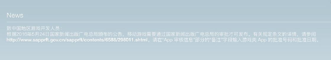 信中称:“致中国地区游戏开发人员:根据2016年5月24日国家新闻出版广电总局颁布的公告,移动游戏需要通过国家新闻出版广电总局的审批才可发布。”这则通知醒目地出现在开发者后台的顶部,并细心地提示了开发者操作方法。“请在App审核信息部分的备注字段输入游戏类App批准号码和日期。”