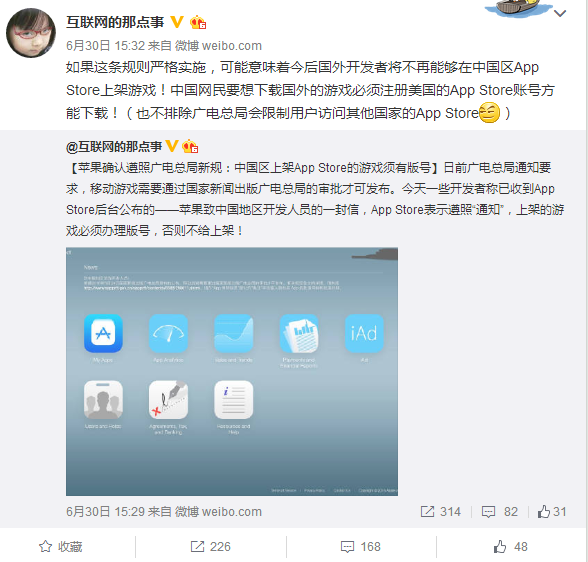 @互联网的那点事还表示,如果这条规则严格实施,可能意味着今后国外开发者将不再能够在中国区App Store上架游戏,中国网民要想下载国外的游戏必须注册。