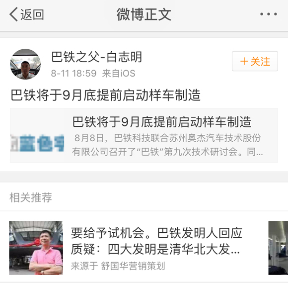 这篇原发于巴铁公司的微信公众号“巴铁科技”的文章,介绍了8月8日巴铁项目组召开“巴铁”第九次工作进度会议的内容。文中较大篇幅引述了一位“同济大学知名学者、国家磁悬浮工程技术研究中心车辆总体设计师何大海博士”的论述,包括“何大海博士强调,巴铁是解决城市交通拥堵的方案,它符合经济发展的需求,符合国家政策法规,符合国家的安全法规,能解决交通实际问题,是未来交通发展的一个方向。所以很多网友对巴铁的很多质疑都是没有任何参考依据的”。形似为巴铁辩护。除了向投资者发送诸如此类的文章外,华赢凯来的业务员在与投资者交流中,也时常做出“巴铁确实正在研发”的解释。而在媒体诸多关于巴铁质疑中,出面回答的往往是担任巴铁公司监事的白丹青,而不见董事长身影。“听其言,观其行”,白丹青和华赢凯来想彻底撇清和巴铁公司的关系,并不容易。