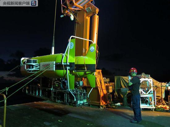 6月1日,“蛟龙”号载人潜水器深潜归来,工作人员在将其回收至“向阳红09”科学考察船上。