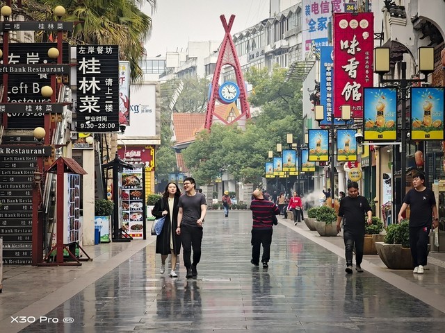 对于vivo X30 Pro而言,它最具吸引力的便是这颗潜望式长焦镜头,它可以带领你的视线去远方,发现远方更多的美好,在实拍过程中,笔者选取了几个原本只有专业摄影师使用长焦镜头所能拍摄的场景进行拍摄,在实操中体验它的长焦拍照能力。首先,笔者来到了桂林著名的东西巷步行街,在步行街的最远处约500米的位置拍摄街中心的钟表塔,分别以超广角、1倍、5倍、60倍变焦拍摄,5倍变焦下,画面空间视角十分合适,发挥了长焦镜头压缩空间的优势,60倍数码变焦可以清晰的看到钟表时间的细节,画面清晰,堪比望远镜效果。