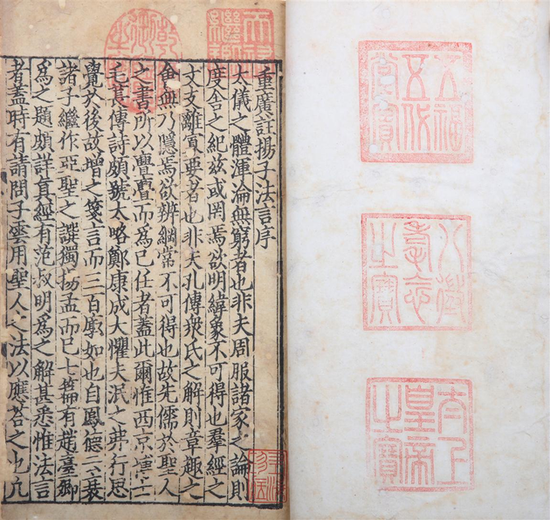 《纂图互注扬子法言》十卷为完整一部,且五玺俱全,文中“征”、“贞”、“桓”、“廓”等字时缺末笔,盖避宋讳,但坊刻避讳不严。曾入天禄琳琅后编,傅增湘1917年曾在宝瑞臣处见过此书,《藏园群书经经眼录》中有记录,之后销声匿迹。据悉,天禄琳琅续编著录的宋版《纂图互注扬子法言》一共三部,第一部、第三部分存国家图书馆和台北故宫博物院,此为第二部,而今将近百年再度现身。