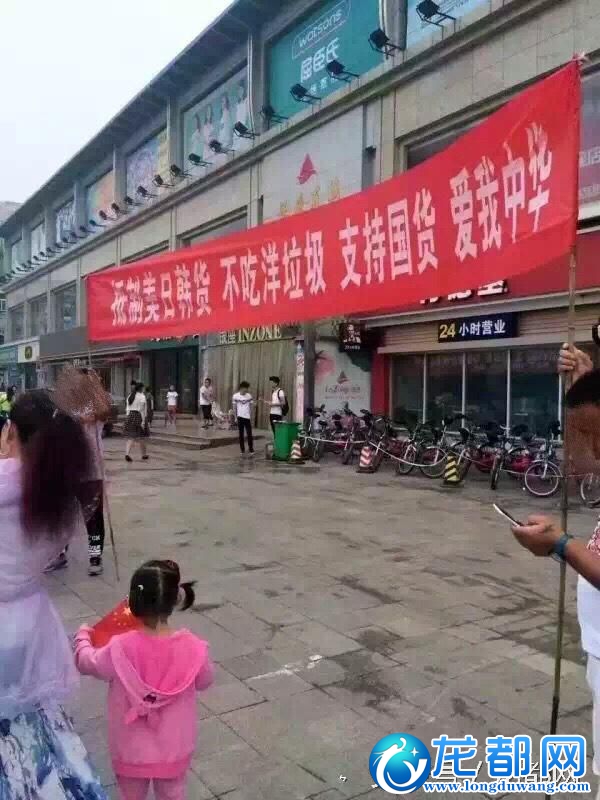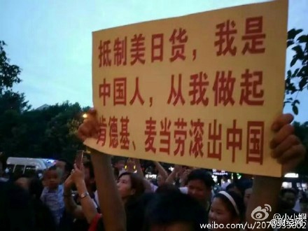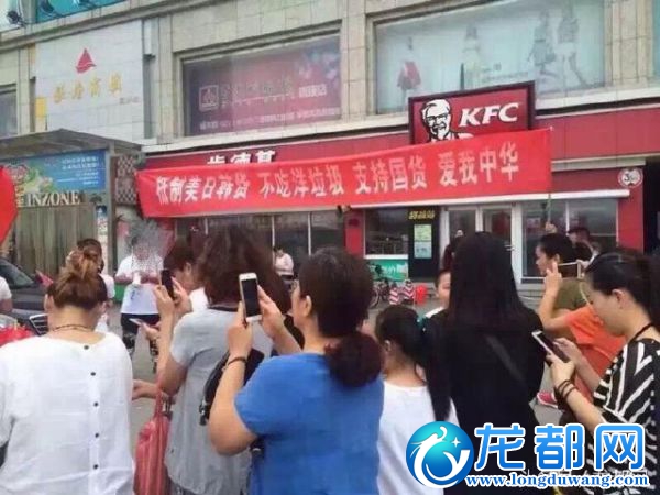 7月17日上午,河北乐亭县肯德基门被群众打横幅围堵。横幅上写着:“抵制美日韩菲,爱我中华民族,你吃的是美国肯德基,丢的是老祖宗的脸。”