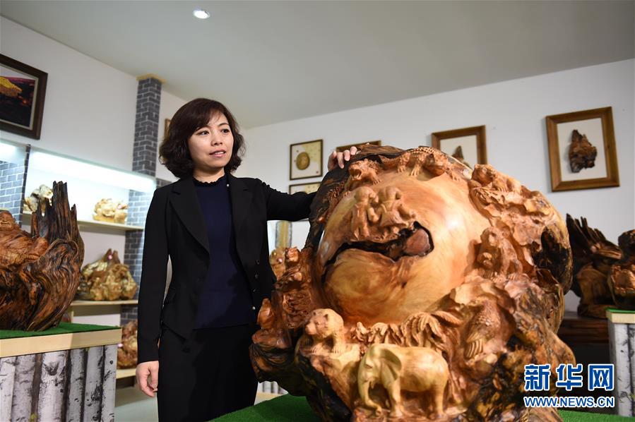 伊春一家公司的负责人在介绍“琥珀木”作品《和谐家园》(5月9日)。有着“红松故乡”之誉的黑龙江伊春市,过去林区群众用于引火的烧材“琥珀木”,近年来经工艺企业开发,变身为一种独具特色的工艺品原料。伊春的“琥珀木”产品2016年得到深度开发,加工企业生产的系列产品年产量达20余万件,推动了林区群众就业和林业经济的转型。新华社记者王建威摄