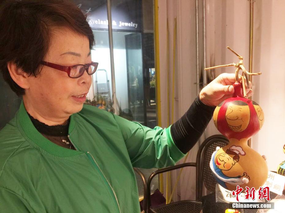 近日,在兰州文化创意产业园内,兰州艺人丁永莲展出自己的创意葫芦,供市民参观。她将葫芦雕刻与漫画二者结合起来进行创作,作品涉及人物漫画、环保宣传、寓言故事等,形象生动,趣味十足。徐雪 摄