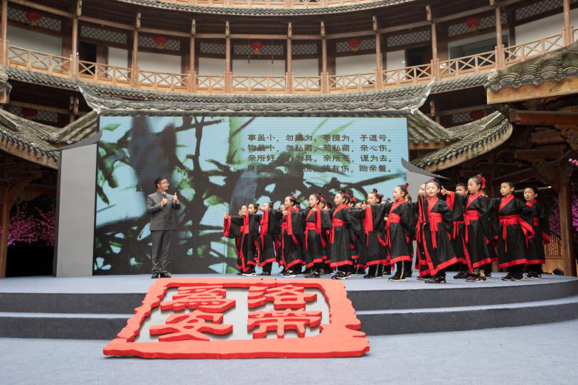 国学推广人陈岳先生则带领着天真可爱的孩童为来宾们诵读了国学经典《弟子规》,演绎客家耕读与传统文化的传承,将现场气氛再次推向高潮。