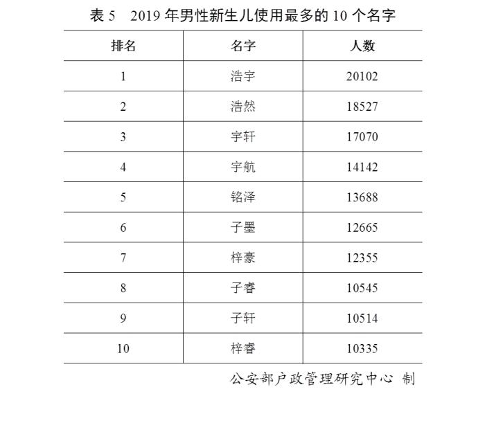 中国经济新闻联播01月20日北京电(记者黄远声)日前,公安部户政管理研究中心发布《2019年全国姓名报告》。报告显示,2019年出生并已经进行户籍登记的男性新生儿中,使用频率最高的10个名字依次为:“浩宇”“浩然”“宇轩”“宇航”“铭泽”“子墨”“梓豪”“子睿”“子轩”“梓睿”。女性新生儿中,使用频率最高的10个名字依次为:“一诺”“依诺”“欣怡”“梓涵”“诗涵”“欣妍”“雨桐”“佳怡”“佳琪”“梓萱”。