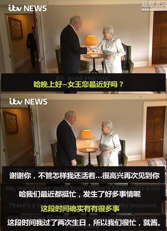 女王握了握他的手,幽默答复道,“十分感谢你,起码还活着”,“我们这段时间十分忙。”