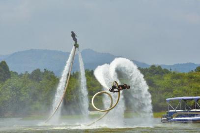 几分钟后,在摩托艇巨大的引擎声中,张凯犹如钢铁侠一般,从水中腾空而起。时而在半空中静止不动,时而从空中飞鱼入水,甚至做出连续空翻……在脚下两条水柱的帮助下,张凯在水面上恣意翻腾,引得岸边的观众阵阵喝彩。