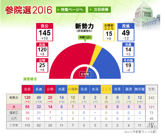 自民党所获议席为55个左右,公明党则获得13个以上,执政两党夺得的改选议席数超过此次改选议席的半数(此次改选121个),在选举中获胜。民进党有43个议席改选,此次所获议席数约30多个。虽然民进党、日共党、社民党、生活党等在野四党在32个改选1人区推出统一候选人携手合作,但未能击败执政党。日共党议席较改选前有所增加。