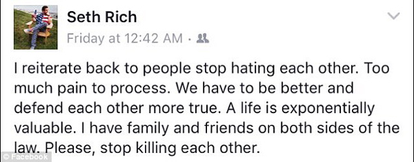 或许,里奇的悲剧仅是由持枪的抢劫犯所酿成,但里奇发布脸书的那天,恰巧是达拉斯大规模袭警案发生的日子,这难免令人将抢劫案升级为政治事件。虽然里奇并未明指贴文与袭警有关,但鉴于里奇民主党身份,且贴文提到双方为法律制订而争执,应该指的是日前民主党与共和党控枪法案之争。