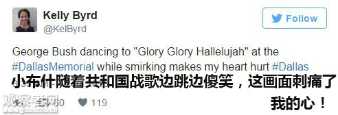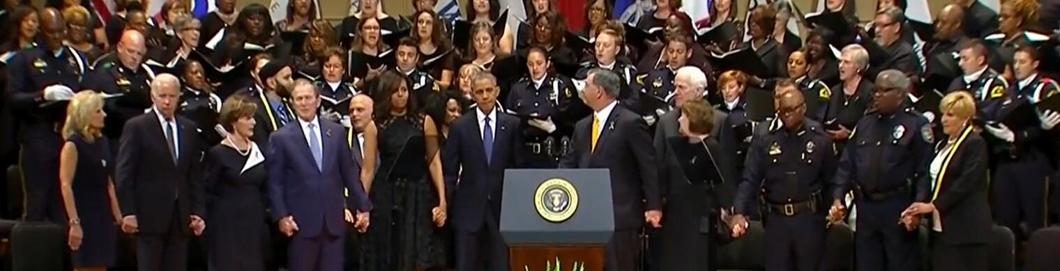 在追悼会上,奥巴马、小布什、他们的夫人和当地官员在台上手拉手,以示团结,乐团演奏《共和国战歌》,表达对殉职警察的追思,于是就有了这一幕……