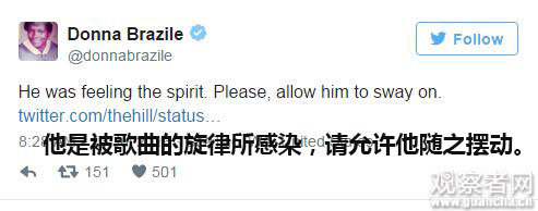 《华盛顿邮报》网站13日是这样描述的:在近5分钟的演奏中,前排的这些人大多数都保持静默,在音乐中默哀,或者默默的跟着哼唱,然而小布什,穿着一套颜色比别人的都欢脱的亮蓝色西装,对音乐的感知可能更深一点,他一手牵着自己的老婆劳拉,一手牵着奥巴马的老婆米歇尔,随着音乐摆动身体,但很显然,这两个人脸上都是大写的不情愿。他的脸上还挂着淡淡的微笑,尽管别人都在默哀。