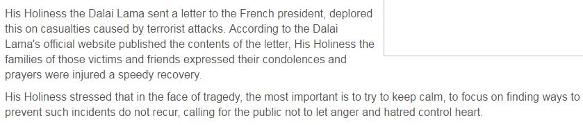达赖致信奥朗德,表示面对惨剧时,最重要的是努力保持平静,呼吁法国大众“不要让愤怒与仇恨控制内心”。