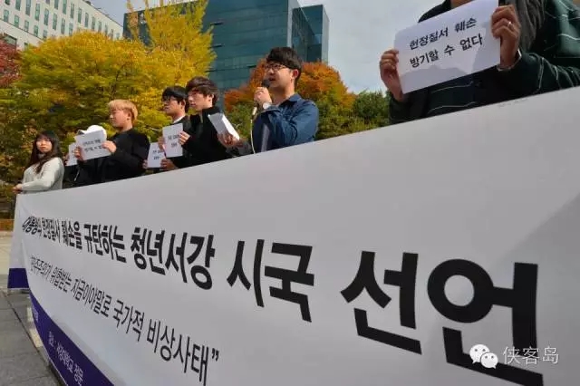 截至10月29日,已有四十多所大学的学生在学校贴出大字报,并发表“时局宣言”,声讨朴槿惠和崔顺实。韩国外国语大学别出心裁地贴出了10种语言的宣传口号(这是要让全世界人民都“评评理”啊),秉承儒家理念的成均馆大学的学生则穿着儒生服打出了“见义不为,无勇也”的木牌。多所大学的教授团体也陆续发表宣言,呼吁朴槿惠下台、成立中立内阁。韩国网上还出现了一份《五十国韩侨敦促朴总统下台书》,表示“总统成为个人的傀儡,这个事实已经满天下皆知了;这是把国家打入深渊的重大犯罪和国家耻辱”。