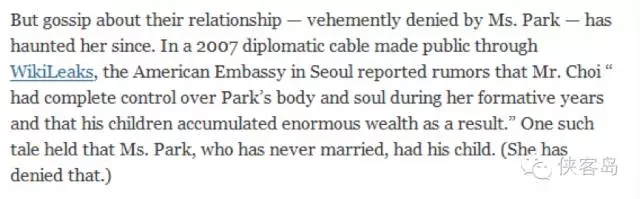 《纽约时报》 10月27日的一篇报道——记者是韩国人,据说是第二位获得普利策新闻奖的韩国人——说,1979年枪杀朴正熙的中央情报部部长金载圭在一次法庭陈述时说,他之所以射杀朴正熙,其中一个原因就是朴正熙未能阻止崔太敏的非法牟利活动,未能让崔太敏远离自己的女儿。该报道继续说“有关朴槿惠崔太敏关系的传闻——朴槿惠曾矢口否认——一直困扰着她。维基解密公开的2007年的一份外交电报显示,驻韩美国使馆曾汇报说,崔太敏先生‘曾在朴槿惠的性格形成期彻底控制了她的身体和心灵,他的孩子们由此积累了巨额财富’。其中一个传言说,一生未婚的朴槿惠与崔太敏之间育有一子(她否认了此点)”。