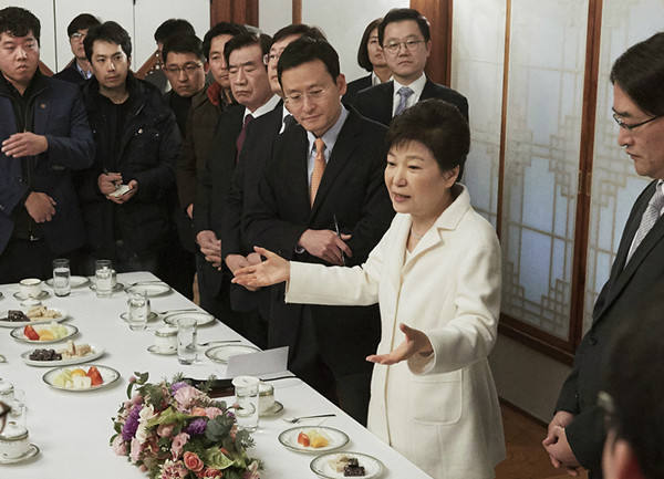 2017年1月1日,在韩国首尔,韩国总统朴槿惠(右二)在记者座谈会上讲话。(新华/美联)